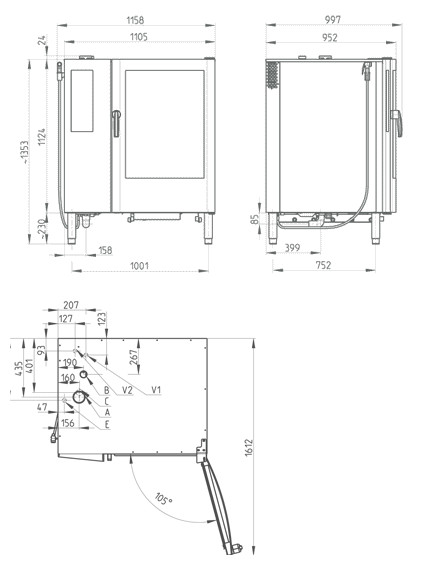 Расстояние от боковых стенок пароконвектомата до других устройств, мебели или стен должно составлять не менее 0,2 м.